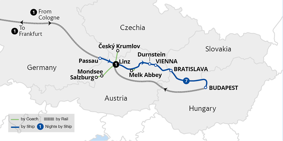 Enjoy a leisurely cruise through four countries and three capital cities, basking in beautiful river scenery all the way. Sail from the German town of Passau through the Austrian wine-growing region of the Wachau Valley, admiring picturesque Dürnstein and Melk Abbey enroute. After exploring imperial Vienna, the captivating Hungarian capital...