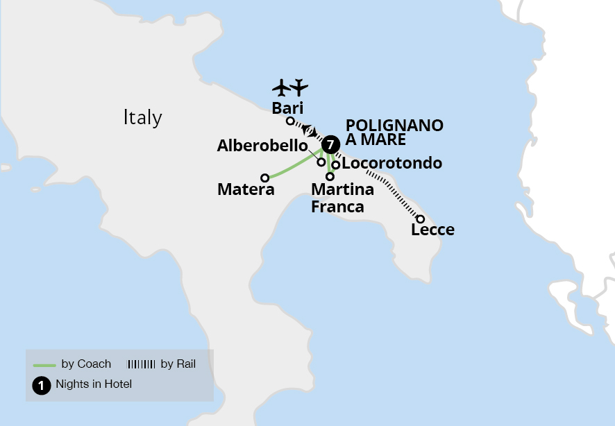Arriving by plane, enjoy our scenic base in a hotel overlooking the coast of Monopoli. From here, experience the incredible sights and traditions of Puglia, a place untouched by the hands of time. Rich with UNESCO World Heritage sites, discover the spectacular trulli homes of Alberobello and the sassi cave dwellings in the cliffside town...