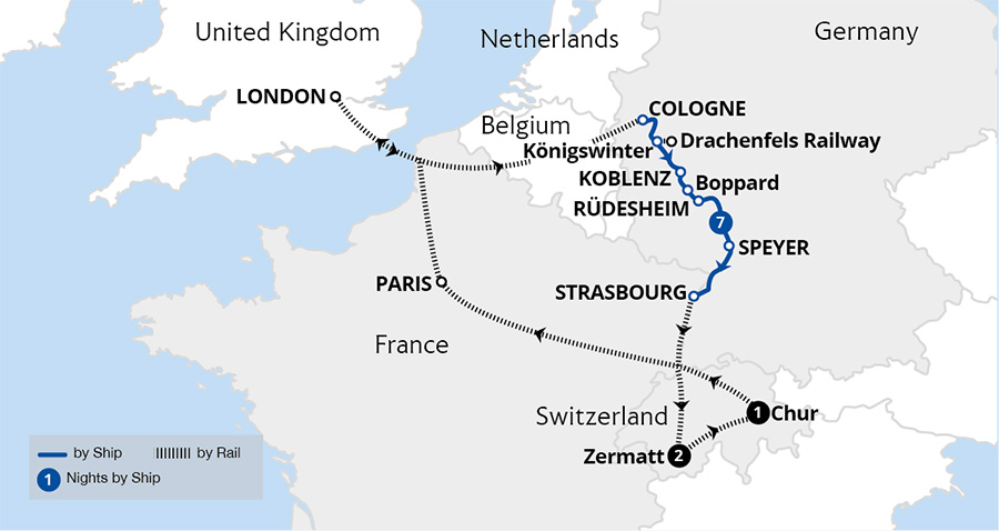 • Switzerland: Discover where the Rhine begins with visits to cloud-kissing Chur, Switzerland's oldest village, and Zermatt, a picture-perfect, car-free mountain village. No trip to the mountainous regions is complete without a ride on the world-famous Glacier Express or Gornergrat Mountain Railway with its views of the Matterhorn.